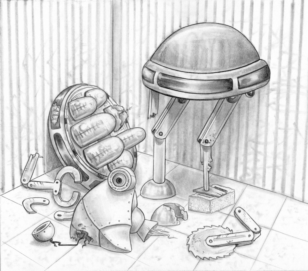 Scattered in the lab are what seem to be robot parts. Whether discarded leftovers or the beginnings of new machines, no one knows.