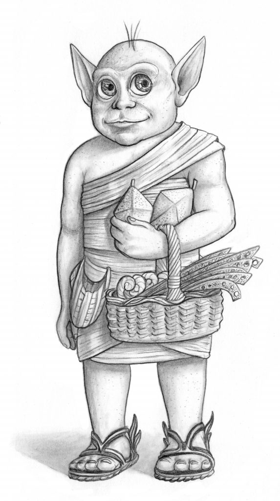Hillkins have wide, expressive eyes, pointed ears, and orange skin. They wear simple wrap-style garments woven from plu plu and live in Hillville, safely enclosed within the Crimson Boundary that shields them from molekins. Their diet includes local plants and their favorite delicacies: chikum and mushcakes. At the heart of their culture lies a strong devotion to the ancient Scrolls of Knowledge.